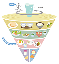 “餐飲平衡表”是2005年6月日本厚生勞動(dòng)。ㄈ毡菊t(yī)療、勞動(dòng)部門(mén))與農(nóng)林水產(chǎn)省一起針對(duì)飲食生活標(biāo)準(zhǔn)采取的具體活動(dòng)之一。“餐飲平衡表”中分為主食、主菜、配菜,按照相應(yīng)的比例體現(xiàn)在圖表中。讓人們可以清楚的看到“吃什么”“吃多少”。