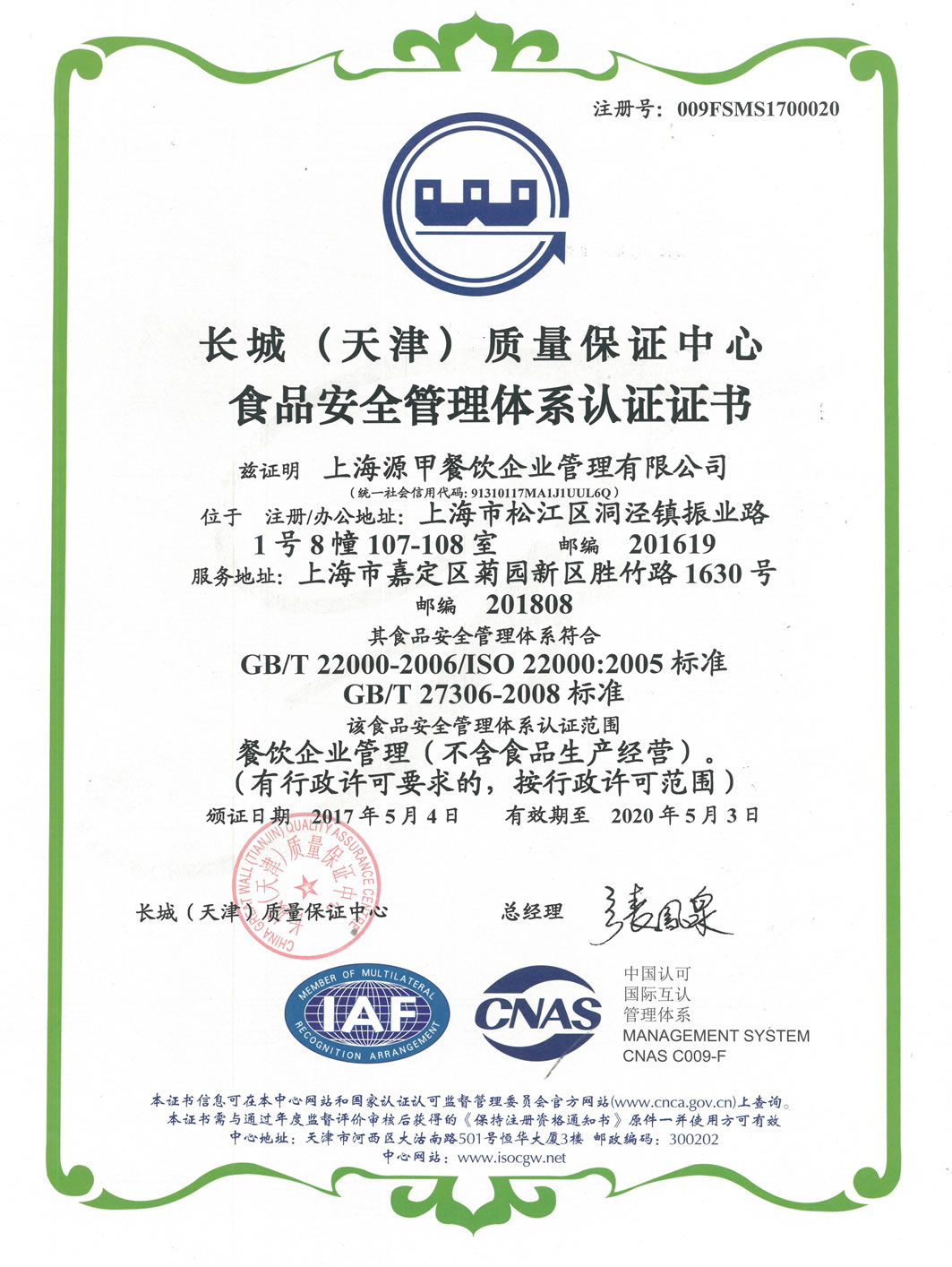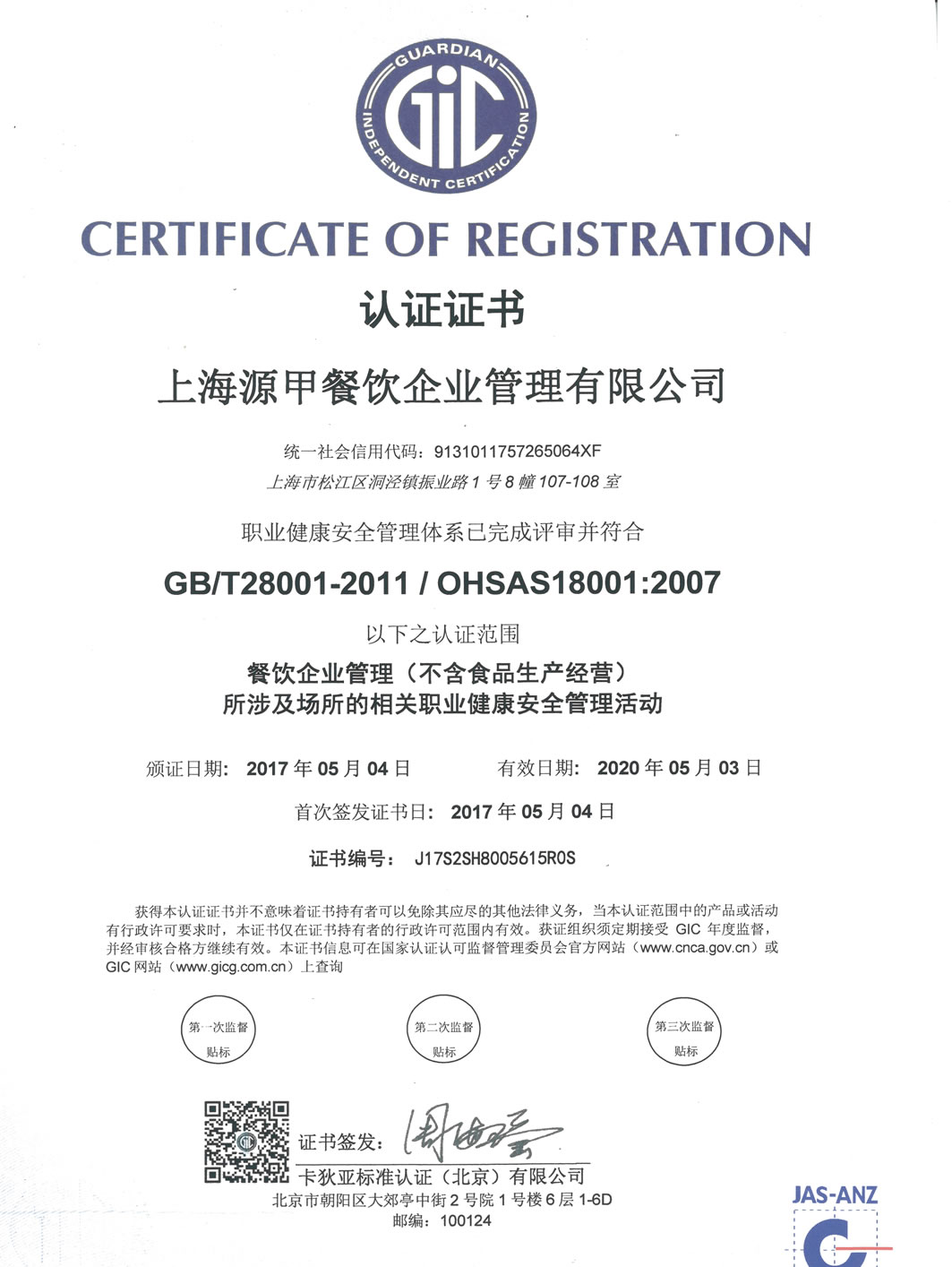 上海源甲餐飲企業(yè)管理有限公司自成立以來,堅持以OHSAS18001職業(yè)健康安全管理體系和ISO22000食品安全管理體系為指導,嚴格把控食品安全,通過不斷的努力建立起來了一套行之有效的食品質量安全管理體系,從食品原材料的采購到加工制作,再到餐飲的配備、管理以及交付,整個過程都會嚴格的把控,將職業(yè)健康安全和食品安全質量體系貫穿整個服務流程當中。