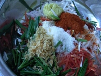 然后再把幾種絲加上洋蔥碎,姜蒜碎,多一點(diǎn)比較好,蝦皮,雞精,白糖,蜂蜜。少量的鹽,和不是很辣的細(xì)辣椒粉,如果能吃辣的話再加點(diǎn)中粗的辣椒粉,具體用量可以按照自己的口味自主搭配。